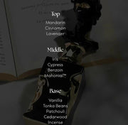 Notas de fondo: Vainilla cálida, haba tonka dulce, pachuli terroso, madera de cedro, incienso místico y ámbar profundo.